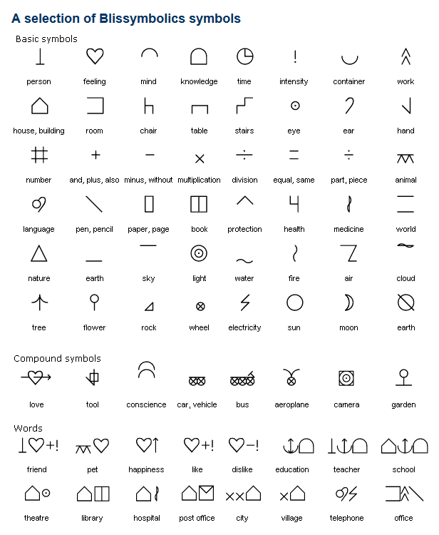 Bliss simbolių kalba yra viena iš alternatyvių augmentinės komunikacijos kalbų (AAC), kuri taikoma dirbant su negalią turinčiais asmenimis Islandijoje, Švedijoje ir kitose šalyse. Švedijoje ši kalba taikoma dirbant su prieglobsčio prašytojais bei Ukrainos karo pabėgėliais. Prasidėjus Rusijos invazijai Ukrainoje, Bliss simbolių kalba buvo skubiai išversta į ukrainiečių kalbą.